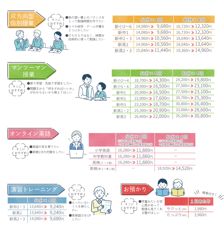 ※お選びいただくベースプランによってサポート内容が異なります。 ライト:自習室利用権・学習面談(年3回まで)・入退室管理など スタンダード:自習室利用権・自習フォロー・学習面談(年4回まで)・テスト対策会参加権・入退室管理など プレミアム:自習室利用権・自習サポと・学習面談(無制限)・テスト対策会参加優先権・入退室管理など ※すべて税込表記です ※授業料は口座により異なります。詳しくはお問い合わせください。